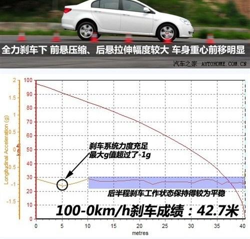 荣威350在刹车测试中的最终成绩为42.7米,虽然这个数字可以让人满意,但需要说明的是,刹车系统需要较长时间才能进入最佳工作状态。
